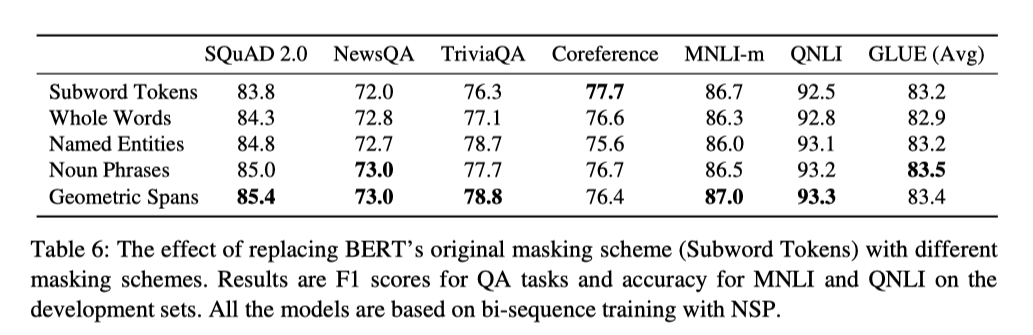 对于不同遮罩机制,作者对比了随机Token级遮罩、整词遮罩、实体遮罩、名词短语遮罩、和Span中提出的几何分布遮罩。结果显示基于几何分布的遮罩效果是最优的。
