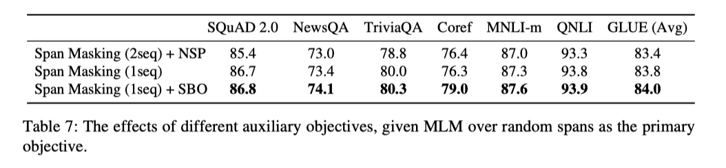 对于辅助任务,SBO搭配Span级MLM有着最好的效果。并且再次印证了单序列输入要比两序列输入拥有更好的效果。