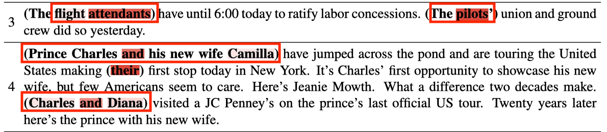 深度学习模型的优势是通过Embedding可以准确找到词语间的相似度,但是这也将导致过多的假阳性案例。比如案例3和案例4中的flight attendants 和 the pilots, Prince Charles Camilla 和Charles and Diana. 模型一旦过度依赖(overuse)词语间的相似性将导致这种情况的频繁发生。