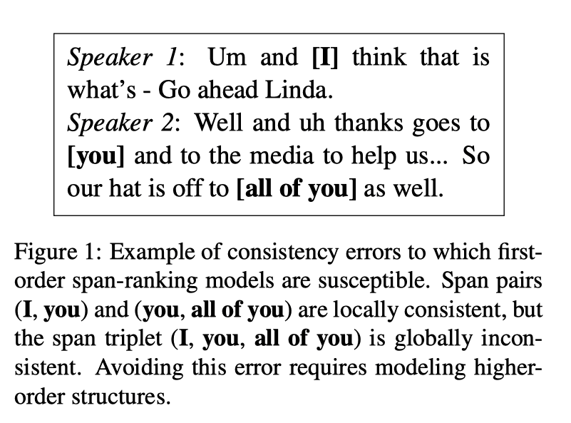 该模型对于文档级共指消解问题提出span-ranking架构,建模为span对评分问题。首先将长度为T的文档分为T(T+1)/2个span并排序,对于每个span,从该span之前的所有span中通过评分函数挑选其最佳的先行词。