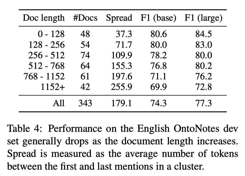 所以这给我们的启示是我们需要更有效编码长序列的预训练模型来完成篇章级的共指消解问题。